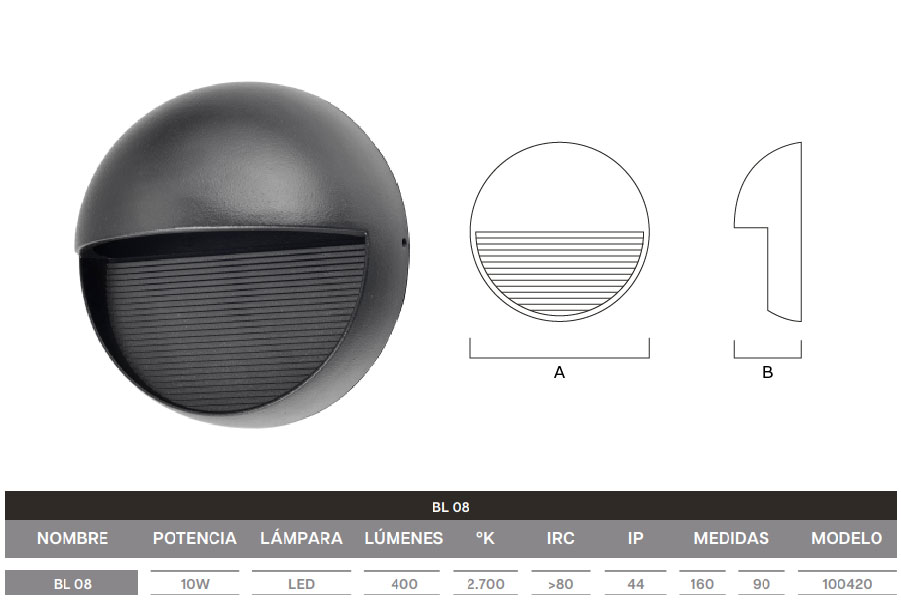 Cuerpo: Aluminio inyectado y difusor de vidrio. Provisto con pintura apta para uso en intemperie.